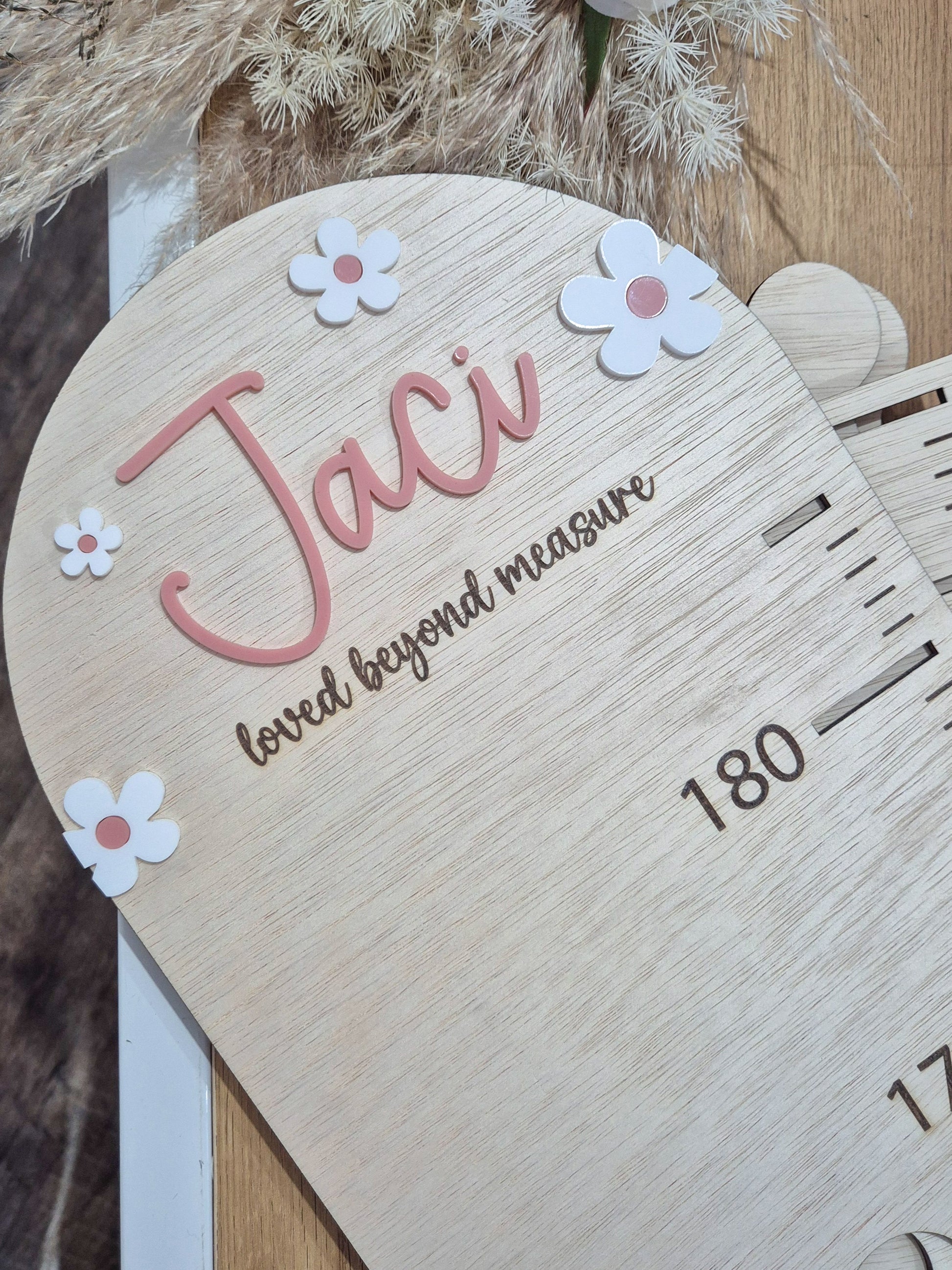 A beautifully personalised keepsake to capture every inch as your little one grows. Featuring delicate engraving, charming designs and your child's name in elegant acrylic lettering — this wooden growth chart is the perfect blend of practicality and sentiment 💕